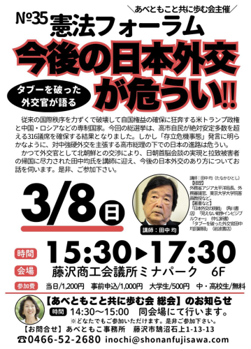 第35回憲法フォーラムでは、元外交官の田中均氏を講師にお迎えし、「今後の日本外交が危うい‼︎」をテーマにお話を伺います。